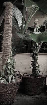 En haut: Culture en panier rempli de tourbe de coco et sphaigne, avec tuteur bois recouvert de fibre de coco.