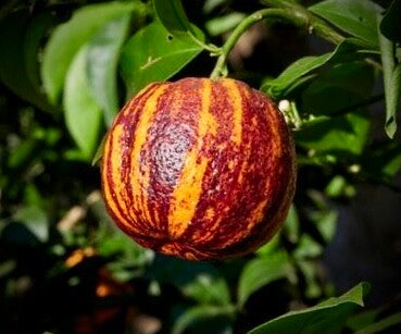 Une coloration assez unique allant du orange au rouge pour un fruit zébré caractéristique et très élégant. Son port ressemble au meyer classique assez trapue et etalé. Sa rusticité est quant à elle un peu moins intéressante.