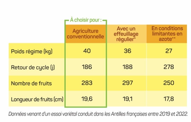 Un bananier nain, trapu de 1m80 à 2m en bout de culture capable de produire des régimes de 27 à 40 kg selon les amendements utilisés. À réserver pour les cultures en serre ou en gros pot (car sa taille lui permet de rentrer en intérieur facilement ) mais sa faible résistance au froid ne le destine pas à une culture pleine terre chez nous.