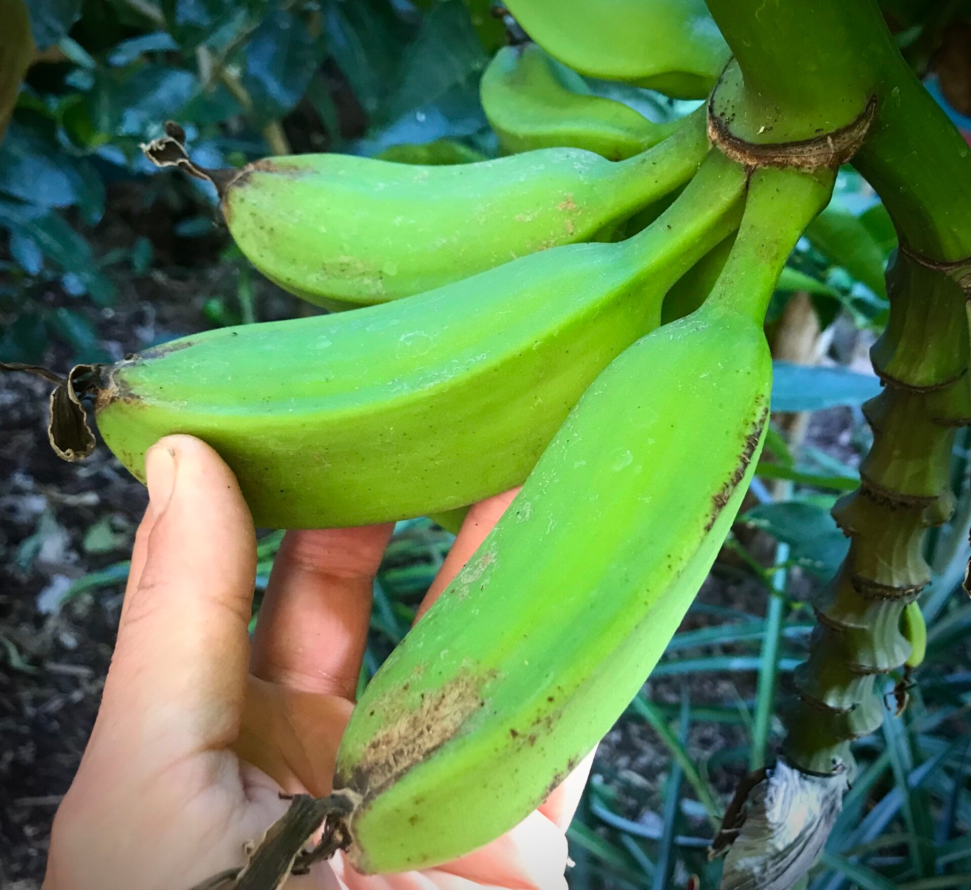 Un bananier nain qui ici n’a pas dépassé les 2 mètres, très peu « encombrant », une croissance rapide pour une résistance à -5°, donc plutôt très chouette pour cette variété fruitière qui donne, au bout de 15 / 18 mois après plantation et selon le mode de culture, de petites bananes fermes et sucrées à la chaire légèrement orangée à cœur